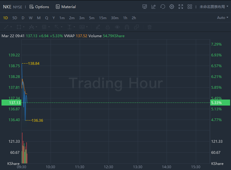 Nike rose over 5% in morning trading after reporting better-than-expected revenue.