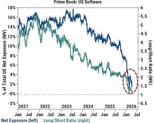 However, Goldman Sachs also warned that the AI-driven drag on long-term profit margins and returns across the software industry remains unaltered—a headwind to valuations that spans the broader market and is not unique to the software sector. At the same time, hedge fund positioning in software stocks is retesting historical lows, with short-selling pressure still dominating market structure.