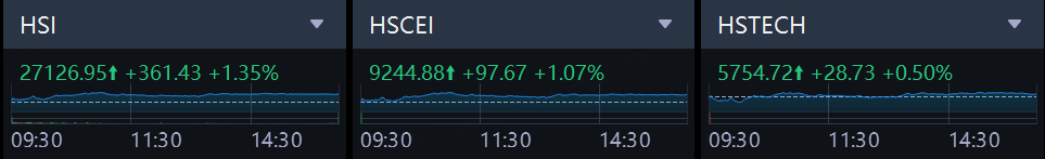 Hong Kong stock market closed higher on Tuesday. The Hang Seng Index rose by 1.35%, the Hang Seng China Enterprises Index increased by 1.07%, and the Hang Seng Tech Index went up by 0.50%.