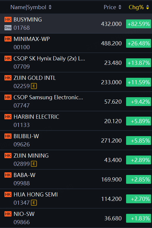 Busy Ming extended rally to 82% in grey market trading; MiniMax up over 26%; Zijin Gold up over 11%; Bilibili up nearly 6%; Alibaba jumped about 3%.