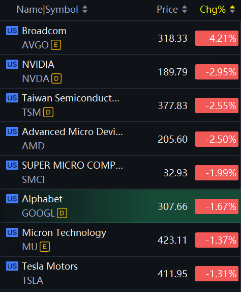 Big tech stocks mostly fell on Thursday. Broadcom fell over 4%; Nvidia down 3%; TSMC, AMD down over 2%; Alphabet, Tesla down over 1%.