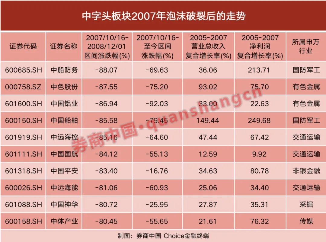 这一幕也似曾相识。在2005到2007年的那波牛市中,由于奥运概念等因素,中字头的大盘股受到投资者追捧,但在泡沫破裂后,中字头板块成为下跌的重灾区。如中国船舶、中国铝业等公司在2018年的跌幅均超过80%,这些公司的股价至今距离当初高点仍然有很大的距离。