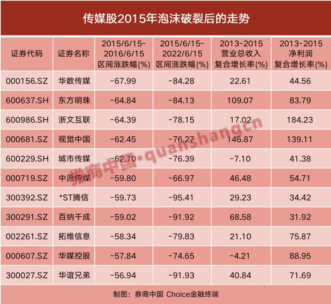 在2013至2015年那波牛市中,传媒概念一飞冲天,但受到诱惑的投资者都付出了惨重代价。距离2015年沪指触及5178点后的一年时间中,多只传媒龙头股跌幅超过60%。迄今为止,7年的时间过去了,部分个股的股价仅剩下当初高点时的一折左右。