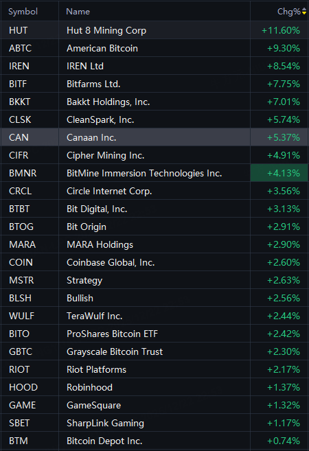 Hut 8 up 12%; American Bitcoin, Iren up 9%; Bitfarms up 8%; Bakkt up 7%; Canaan up 5%; BMNR, Circle up 4%; Coinbase, Strategy rose 3%.