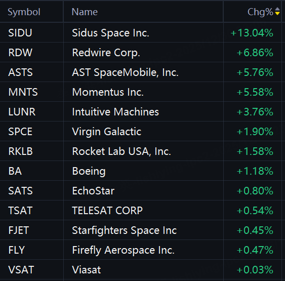 Space stocks jumped in morning trading. Sidus Space rose 13%; Redwire rose 7%; AST SpaceMobile and Momentus rose 6%; Intuitive Machines rose 4%; Virgin Galactic and Rocket Lab rose 2%; Boeing rose 1%.