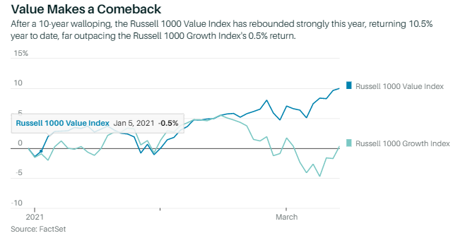 What Davis wants in growth stocks is proven cash flow generation, not expected cash flow years down the road. The distinction between current growth and expected growth is a vital one now because it isn’t just the promise of stimulus driving cyclical value stocks up, but rising interest rates driving high-priced growth stocks down. The stimulus Wall Street expects will cause inflation, which makes bonds with low yields less attractive, so rates on 10-year Treasury notes, after hitting a low of 0.5% last year, are now 1.5%.