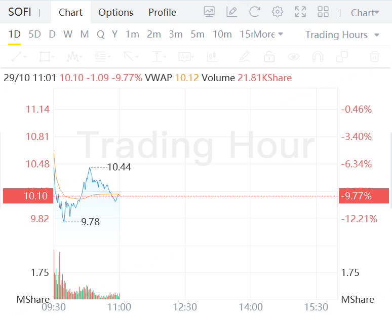 SoFi Technologies shares sank nearly 10% in midday trading.