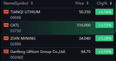 Tianqi Lithium rose 5%; CATL rose 4%; Zijin Mining rose 3%; Ganfeng Lithium rose 2%.