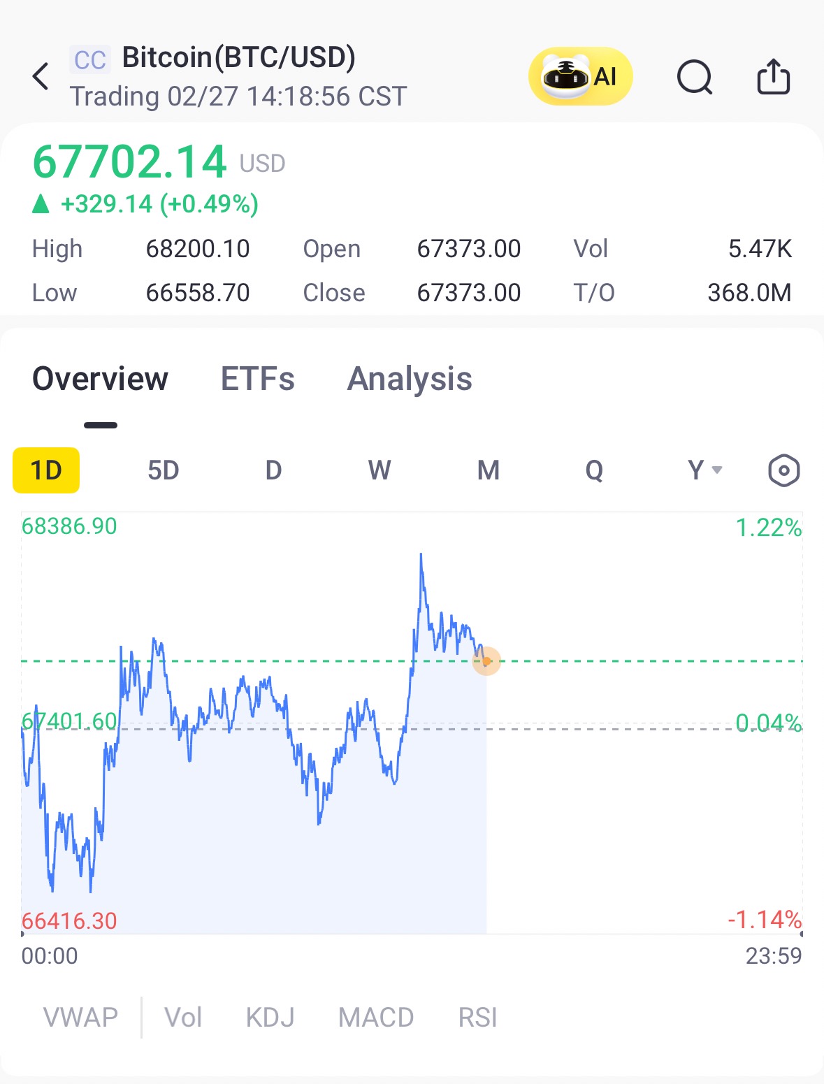 Bitcoin was trading around $67,700, remaining stuck in a narrow range that has defined price action since the Feb. 5 crash, with Wednesday's push toward $70,000 marking the upper boundary and this week's lows testing the middle.