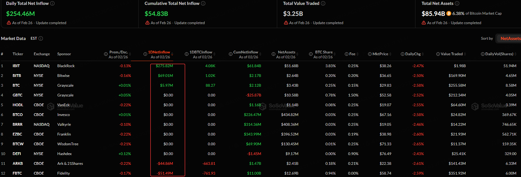 The Bitcoin spot ETF with the highest net inflow on February 26 was iShares Bitcoin Trust , with a net inflow of $275.82 million, according to SoSoValue.