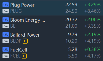 Fuel cell stocks jumped in premarket trading.Plug Power, Bloom Energy, Ballard Power and FuelCell Energy climbed between 3.4% and 8.5%.