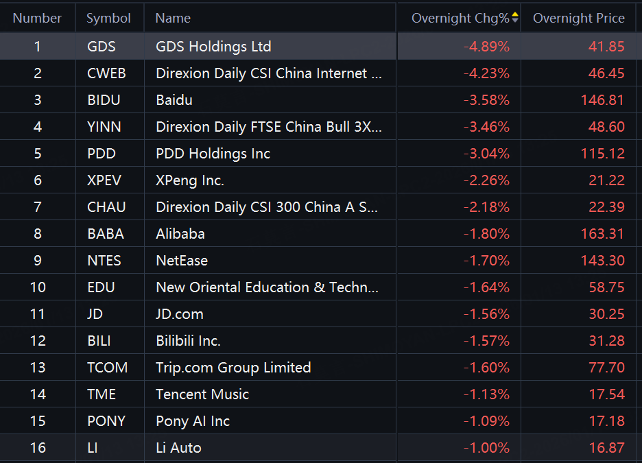 Chinese ADRs and ETFs fell in overnight trading. GDS Holdings down about 5%; Baidu, YINN, PDD Holdings down over 3%; Alibaba, XPeng down about 2%.