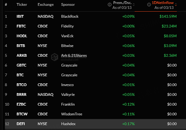 The Bitcoin spot ETF with the highest net inflow on March 13 was iShares Bitcoin Trust, with a net inflow of $143.59 million, according to SoSoValue.