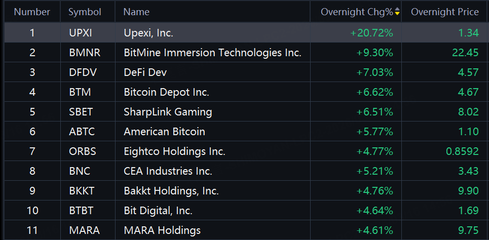 Crypto shares jumped in overnight trading with Upexi up 21%; BitMine up over 9%; DeFi Dev up 7%.