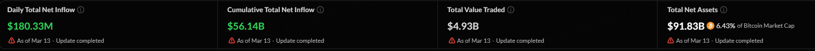 The overall net inflow of the US Bitcoin spot ETF on Friday was $180.33 million. The total net asset value of Bitcoin spot ETFs is $91.83 billion, and the ETF net asset ratio (market value compared to total Bitcoin market value) is 6.43%.