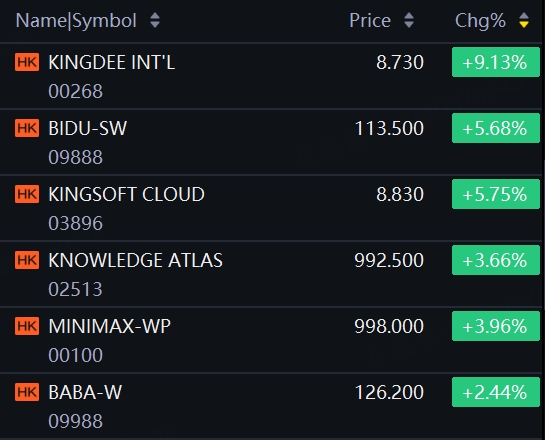 AI software shares jumped in Hong Kong. Kingdee Int’l up over 9%; Baidu, Kingsoft Cloud up over 5%; MiniMax up 4%; Knowledge Atlas up over 3%; Alibaba up over 2%.