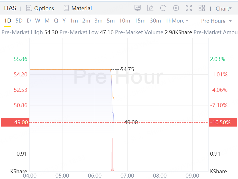 Mattel's shares fell 10% in premarket trading after the Barbie maker held its annual sales forecast unchanged on Wednesday, citing challenging macroeconomic environment.