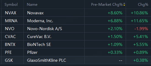 Novavax up 9%; Moderna up 7%; Novo Nordisk, CureVac up 2%; BioNTech up 1%.
