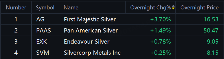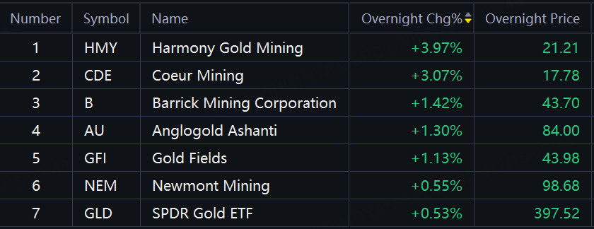 Gold and silver stocks shined in overnight trading. Harmony Gold up about 4%; Coeur Mining, First Majestic Silver up over 3%.