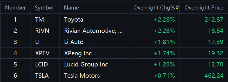 EV shares jumped on Monday. Toyota, Rivian jumped over 2%; Li Auto, XPeng, Lucid up over 1%; Tesla up 0.7%.