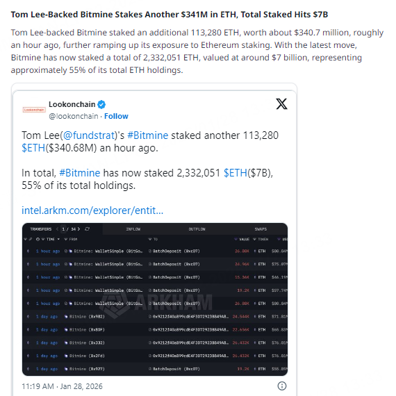 Tom Lee-backed Bitmine staked an additional 113,280 ETH, worth about $340.7 million, roughly an hour ago, further ramping up its exposure to Ethereum staking. With the latest move, Bitmine has now staked a total of 2,332,051 ETH, valued at around $7 billion, representing approximately 55% of its total ETH holdings.