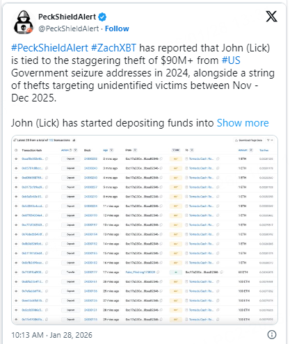 Blockchain investigator ZachXBT has reported that an individual identified as John “Lick” is allegedly linked to the theft of more than $90 million from U.S. government crypto seizure addresses in 2024, as well as multiple thefts targeting unidentified victims between November and December 2025. According to on-chain data shared by ZachXBT, the suspect has begun moving funds through Tornado Cash, with around 11,037 ETH, worth roughly $33 million, deposited into the mixer so far.