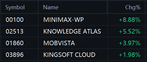 AI application stocks jumped in Hong Kong. MiniMax rose 9%; Knowledge Atlas rose 6%; Mobvista rose 4%; Kingsoft Cloud rose 2%.