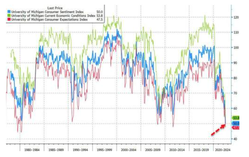 周五公布的数据显示,美国6月密歇根大学消费者信心指数终值50,预期50.2,初值50.2,5月终值58.4。分项指数方面,现况指数终值53.8,再创新低,不及预期的55.4,初值55.4,5月终值63.3;预期指数终值47.5,较初值的46.8小幅回升,5月终值55.2。