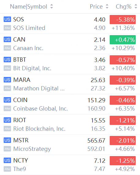 Crypto shares rallied in extended trading. SOS Limited rose 11%; Canaan, Bit Digital rose more than 10%.