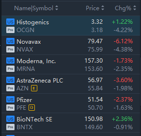 Vaccine stocks slid in premarket trading, with Novavax and Ocugen tumbling over 4%.