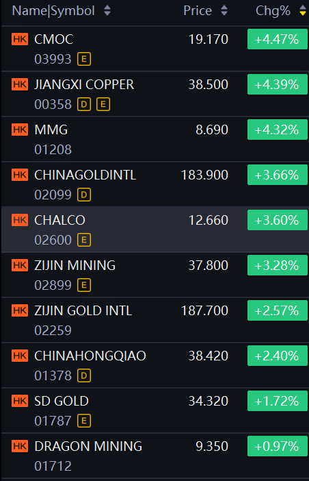 Nonferrous metal shares rallied in Hong Kong market. CMOC, Jiangxi Copper, MMG up over 4%; China Gold, Chalco, Zijin Mining up over 3%; Zijin Gold, China Hongqiao up over 2%.