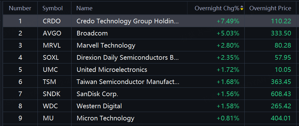 Chip and storage shares jumped in overnight trading. Credo up over 7%; Broadcom up 5%; Marvell up nearly 3%; SanDisk, Western Digital, Micron up around 1%.