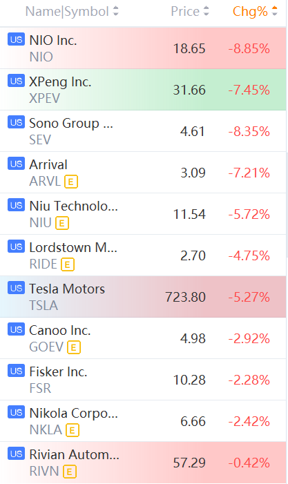 Tesla, Rivian, Nio, XPeng, Lordstown, Fisker, Sono Group and Canoo Inc. fell between 2% and 9%.