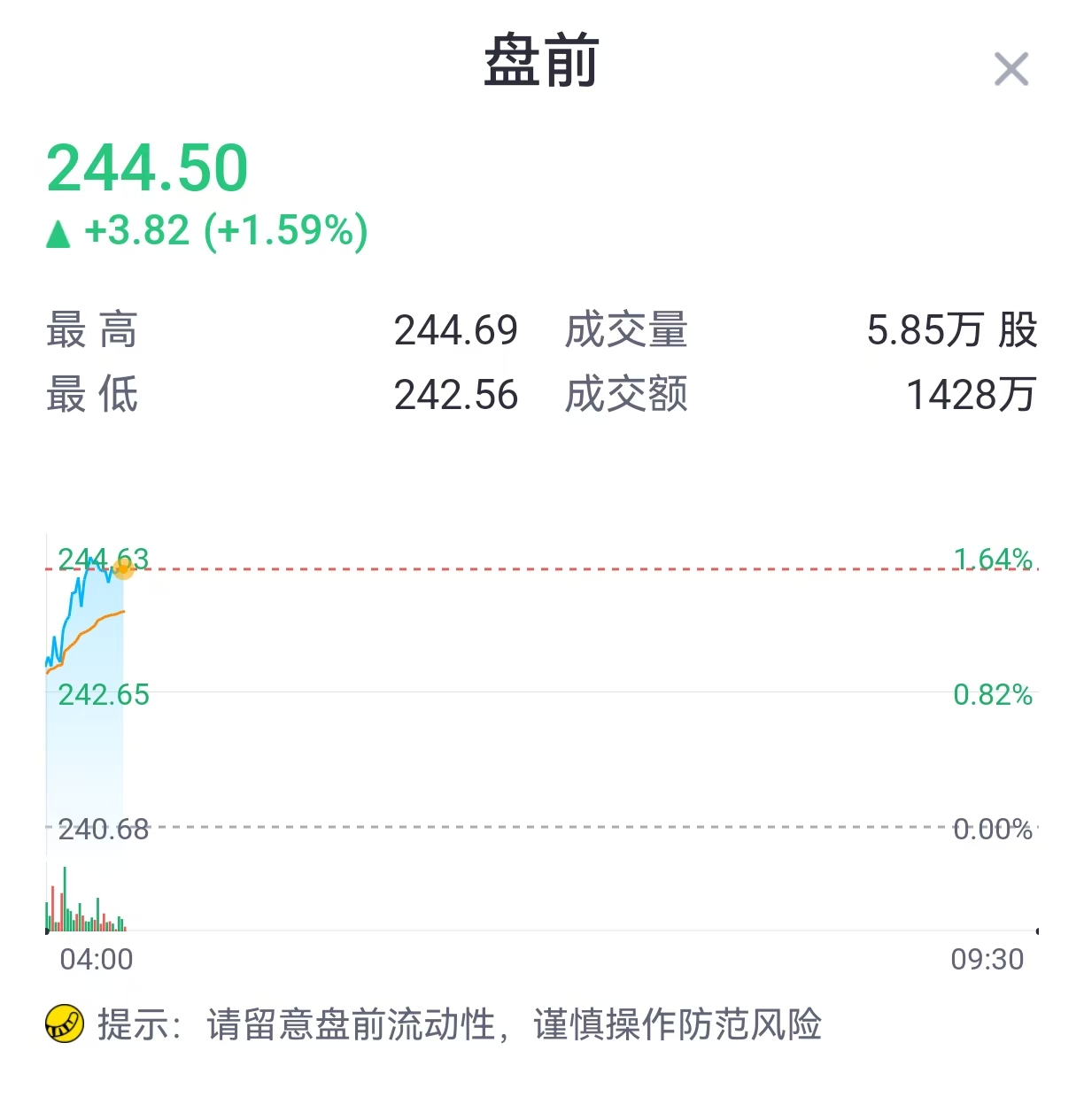 本周五美股盘前, 特斯拉 股价反弹超1.5%,截至发稿报244.5美元: