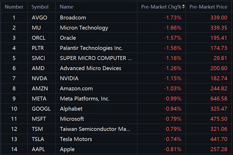 Big tech stocks fell in premarket trading. Broadcom, Micron, Oracle, Palantir, SMCI, AMD, Nvidia, Amazon down over 1%.