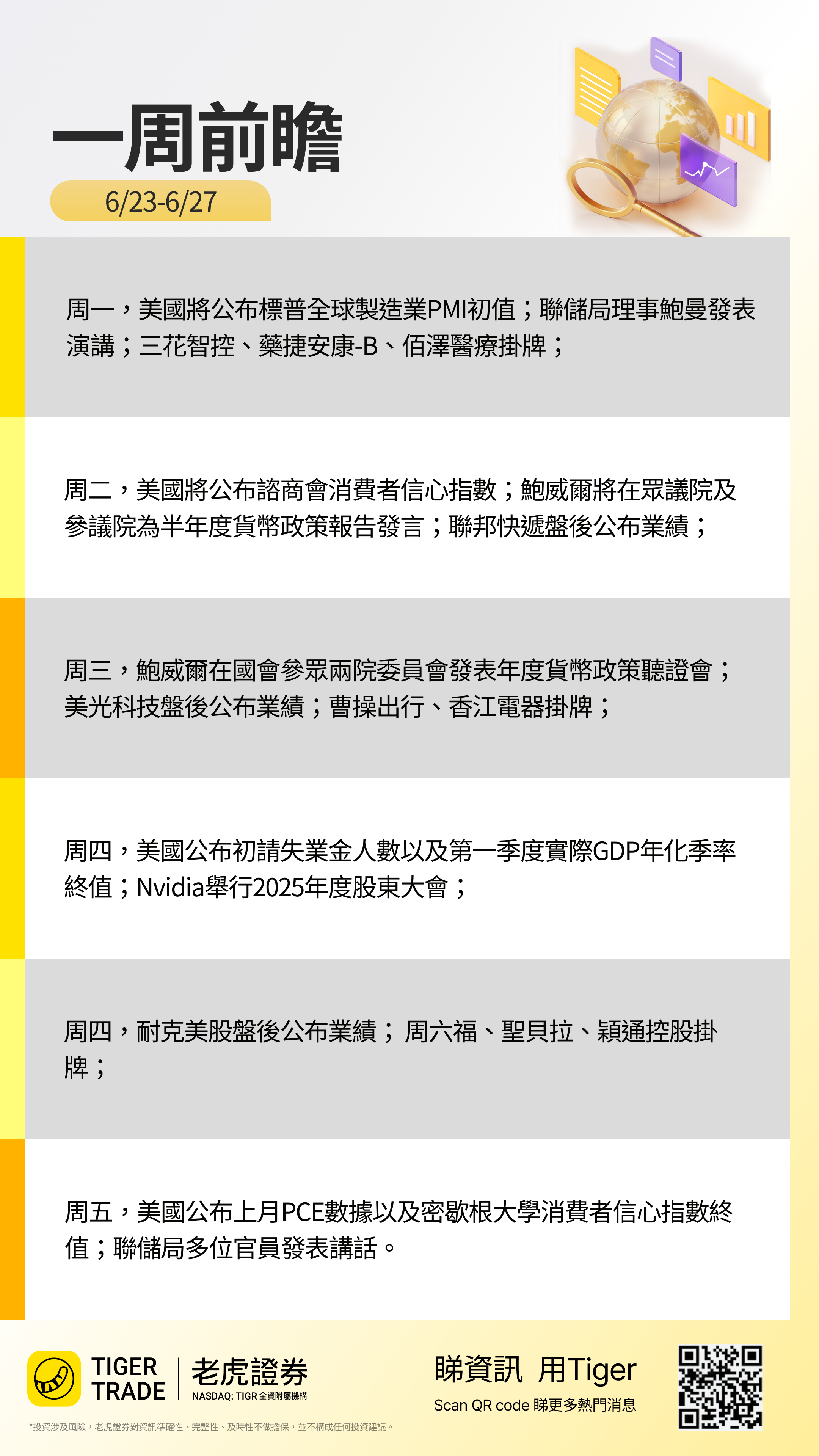 周二,美国将公布谘商会消费者信心指数;鲍威尔将在众议院及参议院为半年度货币政策报告发言;联邦快递盘后公布业绩;