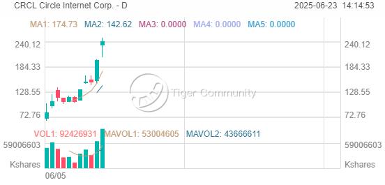 Circle Internet Corp.上周全周仍飙升近80%,该股上周五飙升20.39%后夜盘仍飙升4%,自上市以来 Circle Internet Corp. 狂飙突进,已创下675%的升幅。