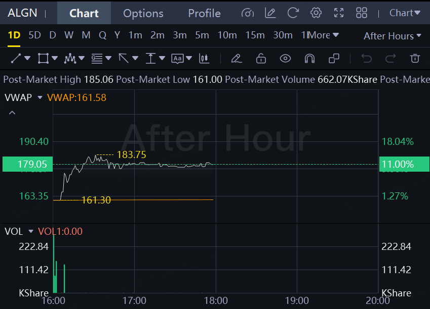 Align Technology stock surged 11% in after-hours trading. The medical device firm's Q4 revenue grew 5.3% yr/yr, beating analyst expectations. Adjusted EPS for Q4 beat analyst expectations. Company repurchased 0.7 mln shares, completing $200 mln buyback plan