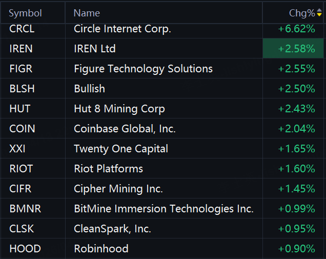 Some crypto stocks jumped in morning trading. Circle rose 7%; IREN, Figure, and Bullish rose 3%; Hut 8, Coinbase, Riot Platforms, and Cipher Mining rose 2%.