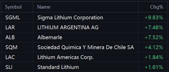 Lithium stocks jumped in morning trading. Sigma Lithium rose 10%; Albemarle and Lithium Argentina rose 8%; Sociedad Quimica Y Minera De Chile SA rose 4%; Lithium Americas and Standard Lithium rose 2%.