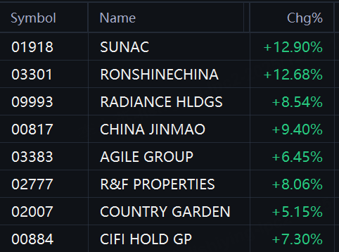 Its peers also jumped in Hong Kong. Sunac and Ronshine China rose 13%; China Jinmao and Radiance rose 9%; R&F Properties rose 8%; CIFI Holdings and Agile Group rose 7%.