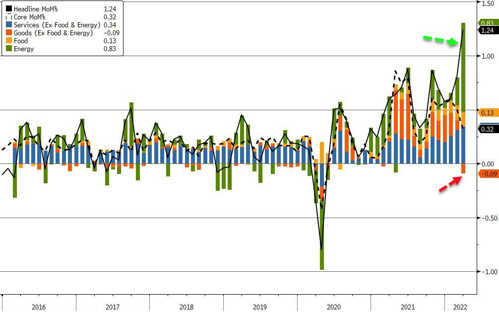 这已经是CPI连续第22个月上涨,商品通胀实际上环比下降,而能源价格飙升。