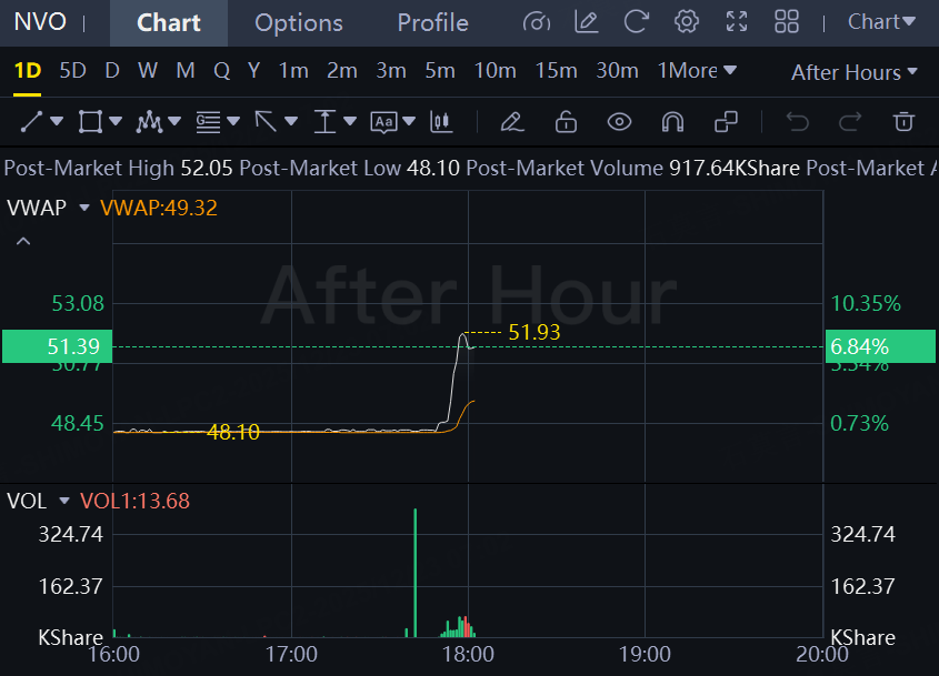 Shares of Novo Nordisk jumped 6.84% in extended trading on the news.