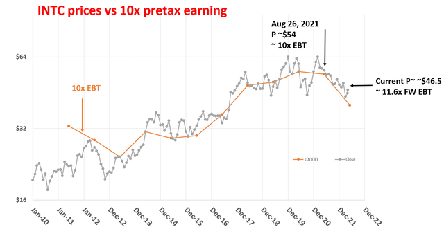 As seen from the chart below, the market now presents INTC as such an opportunity. The following chart shows the price history of INTC and its 10x pretax earnings. Pretax earnings are also referred to as "EBT", Earnings Before Taxes, in this article. As seen, for a business like INTC, whenever the price is near or below 10x EBT, it had a good time to buy (and vice versa). At the time of my last analysis, its valuation was at 10x EBT, and now it is about 11.6x FW EBT. Not the exact fit for the 10x EBT rule, but pretty close.