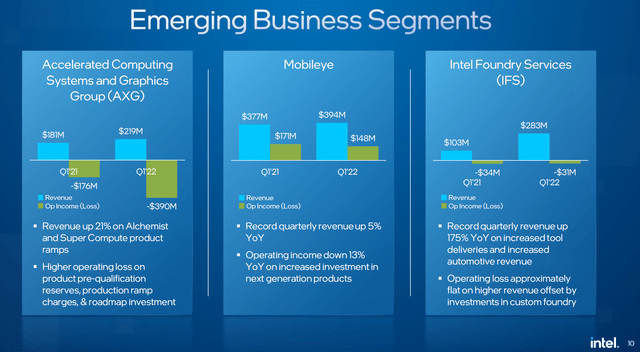 I am optimistic that INTC can maintain and even improve its ROCE In the near future. It has been pursuing several high-growth and high-margin future directions. In Q1 2022, 3 of its 6 newly formed segments (NEX, Mobileye, and IFS) all achieved record quarterly revenue. Mobileye saw a record quarterly revenue of $394M, up 5% YoY. Mobileye also demonstrated its Level 4 self-driving system in Jerusalem, a major milestone in preparation for its upcoming robotaxi services. IFS also saw record quarterly revenue up 175% YoY thanks to increased tool deliveries and increased automotive revenue.