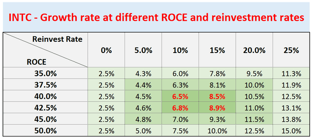 With the ROCE estimated, we can estimate the long-term growth rate, as shown in the next chart. This table shows the long-term growth rate at different combinations of ROCE and reinvestment rate. I assume a 10~15% as a long-term reinvestment rate for INTC even though it will be reinvesting more in the next few years due to the foundry initiative. Note that in this table, I also added 2.5% of inflation to the growth rate. I think this is justified as INTC has demonstrated in the past it has the pricing power to adjust for inflation.