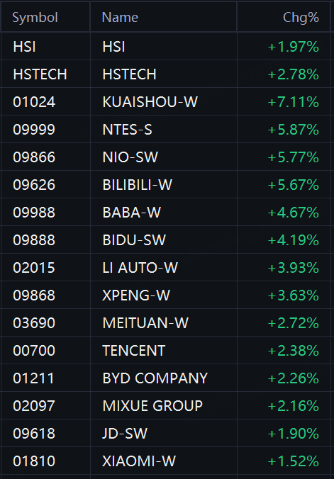 In terms of star stocks, Kuaishou rose 7%; NetEase, NIO, and Bilibili rose 6%; Alibaba rose 5%; Baidu, Li Auto, and XPeng rose 4%; Meituan rose 3%; Tencent, BYD, Mixue Group, JD.com, and Xiaomi rose 2%.