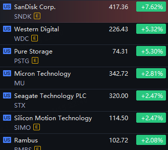 Storage Stocks Jump. SanDisk up 8%; Western Digital and Pure Storage up 5%; Micron and Seagate up 2%.