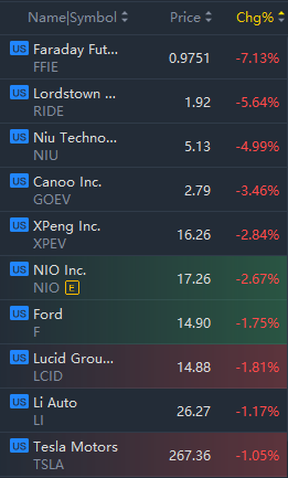 EV stocks slumped in morning trading, with Faraday Future sliding over 7% and XPeng sliding nearly 3%.
