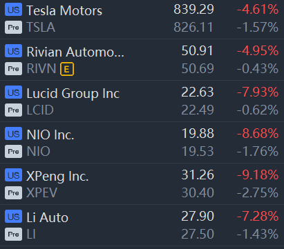 EV stocks slid in premarket trading. Tesla, Nio, XPeng and LI Auto fell between 1% and 3%.